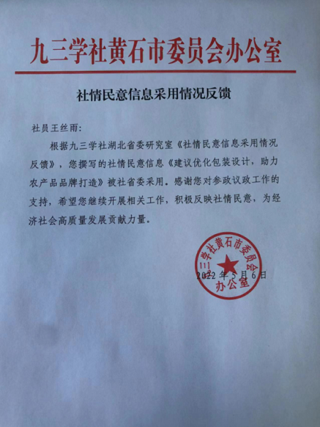 近日,据九三学社黄石市委员会反馈,华体线上平台_华体online(中国)教育与艺术学部专任教师王丝雨撰写的社情民意信息《建议优化包装设计,助力农产品品牌打造》被九三学社湖北省委采用。