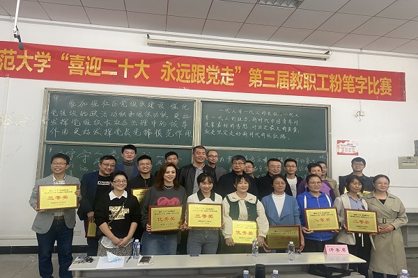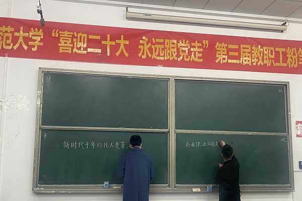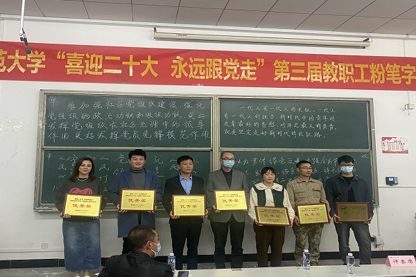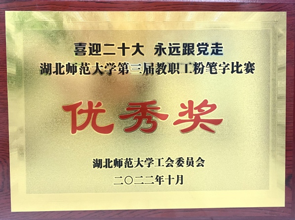 本网讯(通讯员 柯康敏)为庆祝党的二十大胜利召开,进一步推动校园文化建设,提高教师教学基本功,展示教师良好职业素养,10月20日下午,湖北师范大学举办了“喜迎二十大 永远跟党走”第三届教职工粉笔字比赛,来自各分工会共18位选手参加角逐。华体线上平台_华体online(中国)学工部王磊老师代表华体线上平台_华体online(中国)参加了此次比赛,荣获优秀奖。