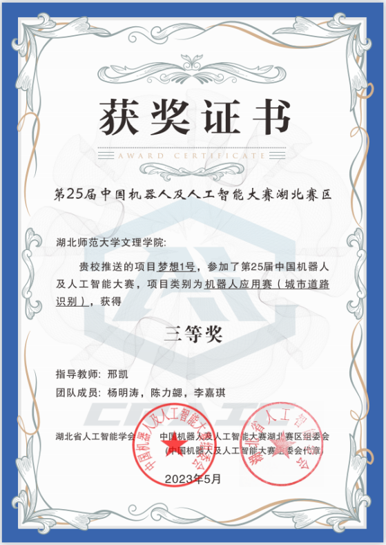 本网讯 (通讯员 邢凯)5月13日-14日,2023年湖北省人工智能大赛暨第二十五届中国机器人及人工智能大赛(湖北赛区)在武汉工程大学举行,华体线上平台_华体online(中国)由邢凯老师指导,杨明涛、陈力勰、李嘉琪三名学生组成的团队荣获三等奖。