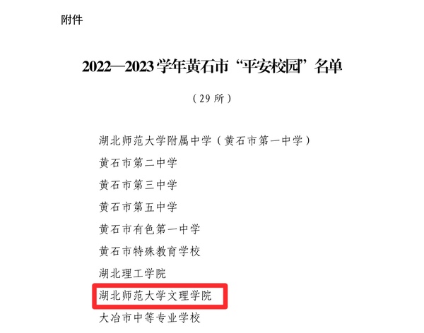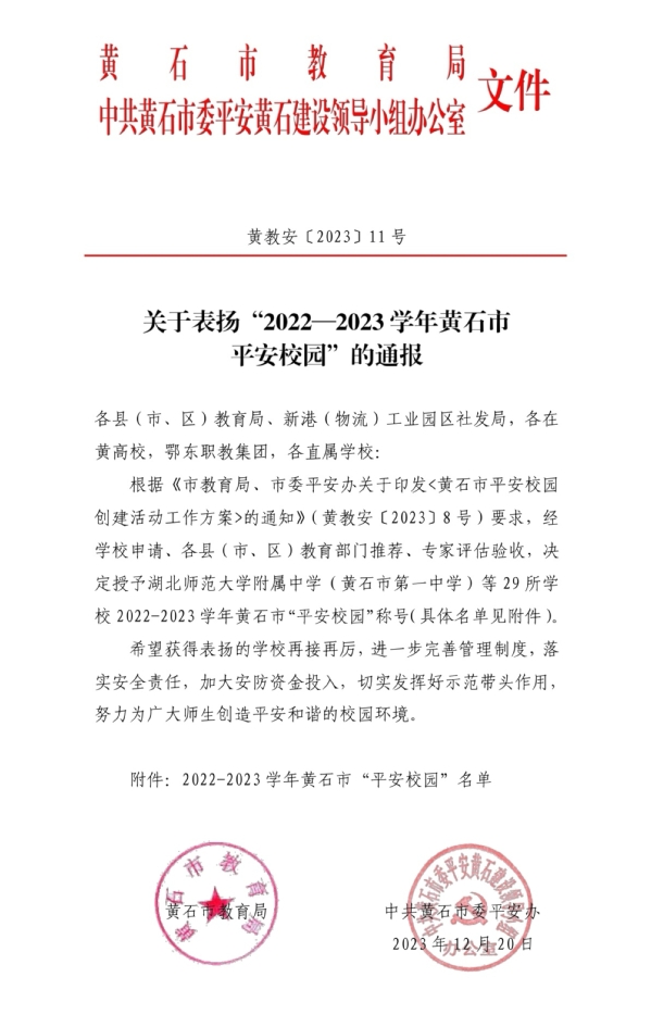 本网讯(通讯员 涂亦乐)根据黄石市教育局、中共黄石市委平安黄石建设领导小组办公室消息,华体线上平台_华体online(中国)喜获“2022-2023 学年度黄石市平安校园示范校”的荣誉称号。至此,华体线上平台_华体online(中国)已连续2年获评黄石市“平安校园”称号。