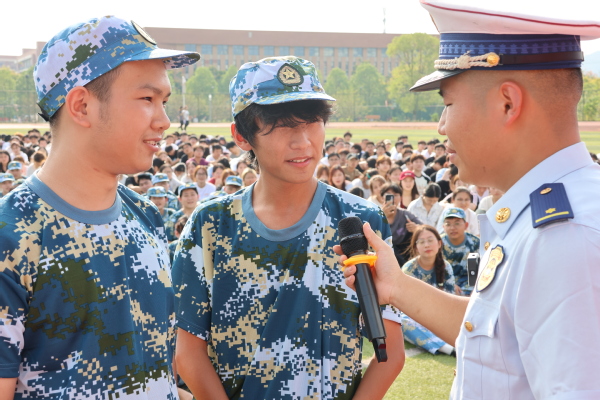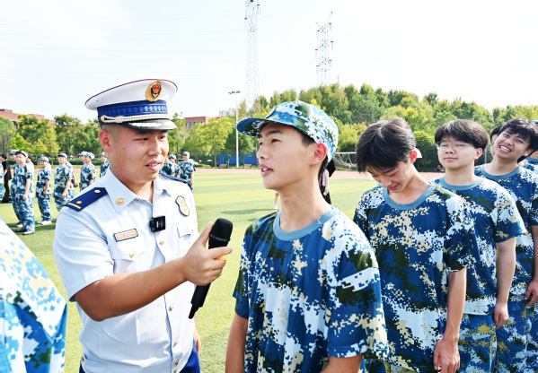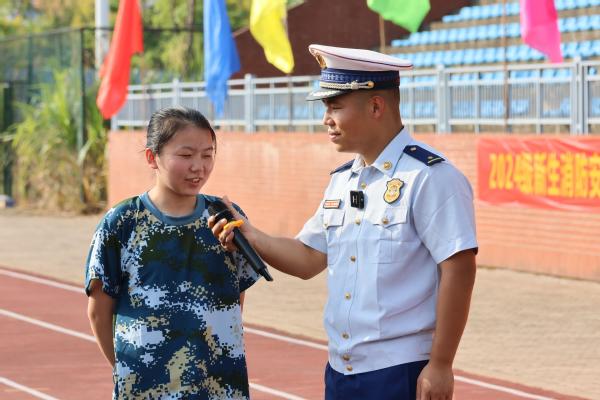 活动开始,开发区·铁山区消防救援大队消防员张惟现场挑选部分学生组成代表队,开展军姿、队列训练等军训科目比试。在比试中,消防员穿插消防安全知识问答,答对学生即可获得奖励。