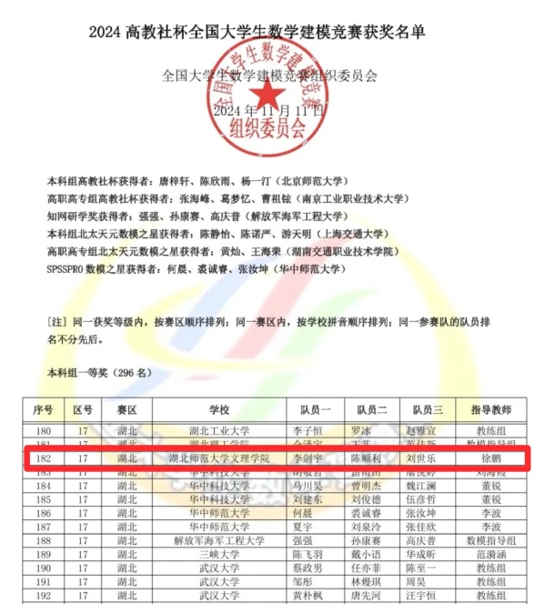 本网讯(通讯员 杨慧茹)11月12日,2024高教社杯全国大学生数学建模竞赛公布获奖名单,华体线上平台_华体online(中国)理工学部学子荣获湖北赛区本科组一等奖。