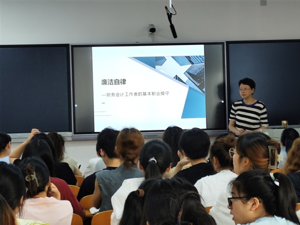 10月14日,财务管理专任教师李红湘以《廉洁自律——财务会计工作者的基本职业操守》为题,开讲第一课。