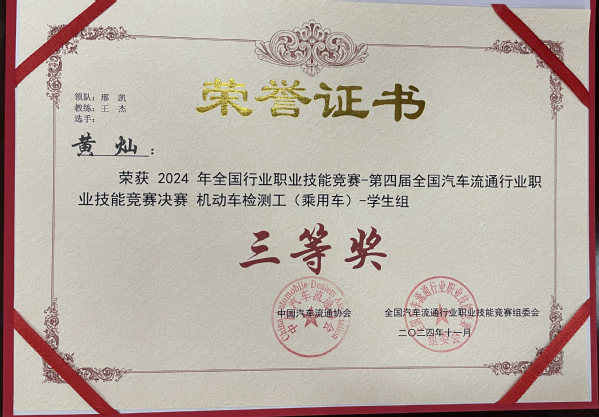 本网讯(通讯员 谭姣12月1日上午,2024年全国行业职业技能竞赛——第四届全国汽车流通行业职业技能竞赛机动车检测工(乘用车)赛项总决赛在许昌科技学校圆满落幕。华体线上平台_华体online(中国)新能源汽车产业学院新能源汽车技术专业2204班黄灿同学荣获学生组国赛三等奖。