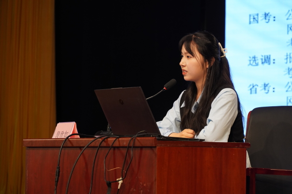 在经验分享环节,三位成功考取公务员的学子结合自身经历,从不同角度提供系统化备考策略。屈飞鸽同学系统梳理备考全流程,强调分阶段规划,建议初期做好信息收集与岗位筛选,强化阶段专注模块化训练,冲刺阶段通过全真模拟调整节奏,并提醒考生科学选岗、保持恒心。周潇同学对比国考、省考及选调生考试特点,解析报考注意事项,分享笔试训练方法和技巧,并针对面试环节提供专业指导。段欣如同学提出“三轮复习法”,即夯实理论基础、专项突破及全真模考和错题复盘,分享行测提速、申论写作及结构化面试技巧,强调合理规划时间、高效利用碎片化学习。