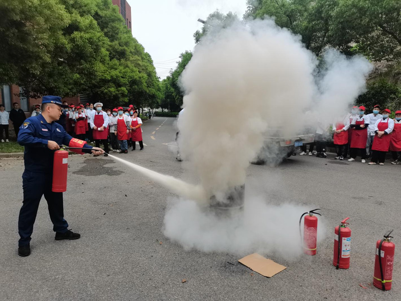 培训中,消防大队吴教官重点讲解了食堂火灾发生的原因、怎样预防火灾、初期火灾扑救流程和火场逃生基本技能,以及食堂油锅着火的正确处理方法和如何正确报警等知识。随后,现场组织了消防灭火演练,吴教官对干粉灭火器的使用方法和消防水带的连接使用进行了讲解和实地操作。