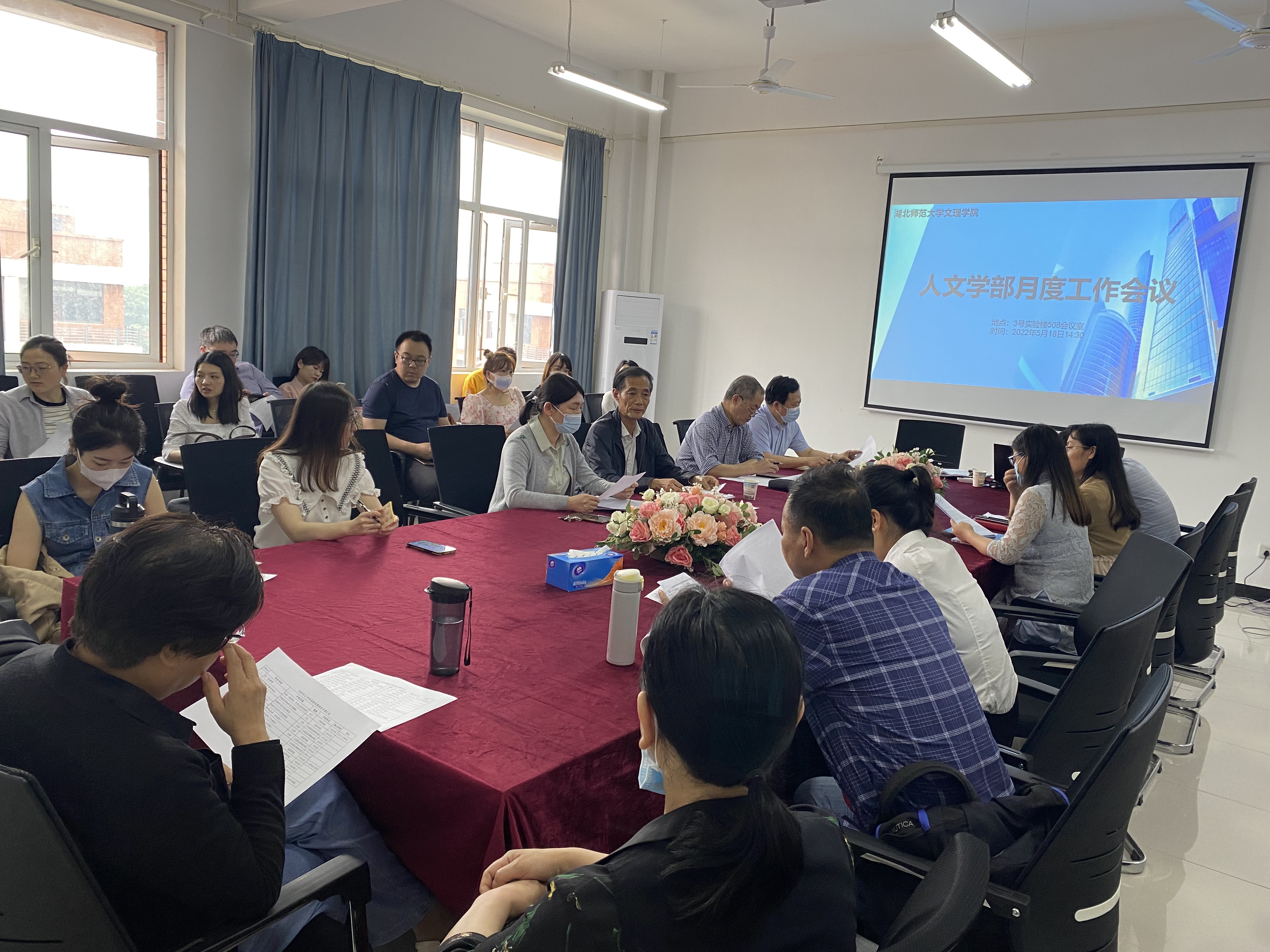 2022518日下午两点半,人文学部在3号实验楼508会议室召开了5月份人文学部全体教职工工作会议,参与此次会议的有人文学部主任熊子延、学部党总支副书记汪玉宝以及人文学部全体教职工。