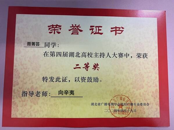 人文学部中文2306班聂菁芸同学经过层层选拔,代表华体线上平台_华体online(中国)参赛,在比赛中不畏强手,以扎实的基本功、饱满的精神状态和灵活的临场应变能力,在比赛中脱颖而出,荣获二等奖。