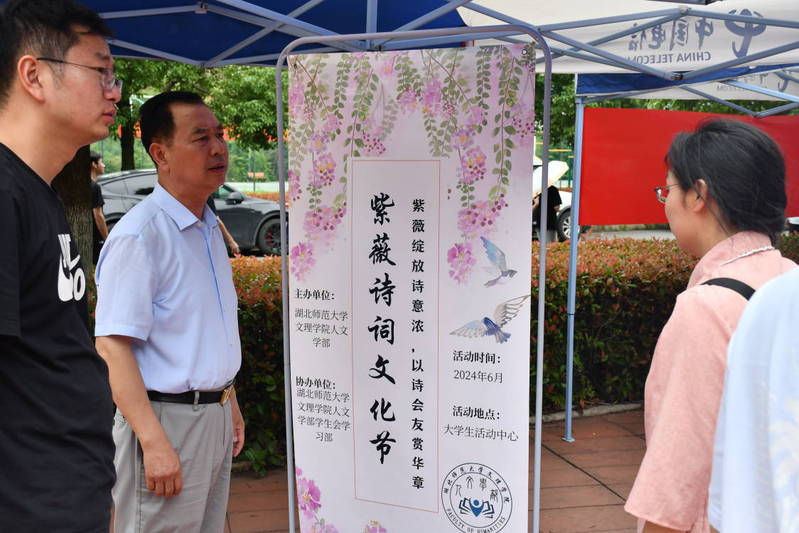 为了传承和弘扬汉字文化,让更多同学了解并爱上诗词,加强校园文化建设,加深同学们对中华优秀传统文化的认识和理解,提高自身文化自信,202464日上午,人文学部发挥学部优势与力量,在活动中心精心筹办以“紫薇绽放诗意浓,以诗会友赏华章”为主题的紫薇诗词文化节,学部主任熊子延、党总支书记周景斌带领学部辅导员老师亲临活动现场。本次活动依托文理校园“紫薇花”特色,活动圆满落幕,为广大师生带来了一场别开生面的文化盛宴。