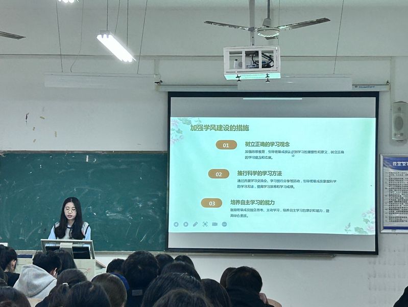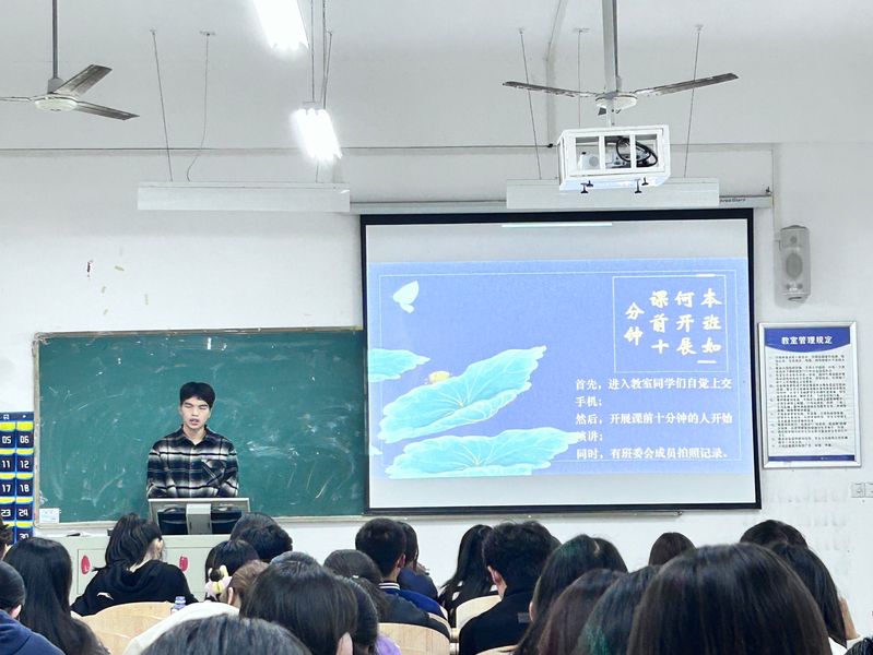 为深入推进课前十分钟主题活动的开展,人文学部组织团学于2024年10月28日19时——20时30分在2A304教室举行了“弘求知之智,建优良学风”课前十分钟风采展示大赛。活动伊始,主持人简要介绍了活动目的、出席人员及规则。选手们依次上台进行演讲,内容分为两个板块:首先,讲述本班课前十分钟的开展情况;其次,结合现场主题,利用PPT进行个人展示,其中课前内容展示占比约20%,个人展示占比约80%。