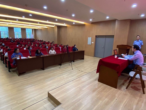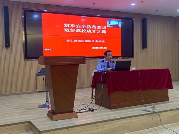 9月23日下午,汪仁镇派出所副所长李福奎一行3人来到华体线上平台_华体online(中国),开展法治教育进校园活动。活动采取网络授课的形式进行,在信息中心报告厅设主会场,在各学部教室设分会场,2020级1300余名本科新生参加了听课。