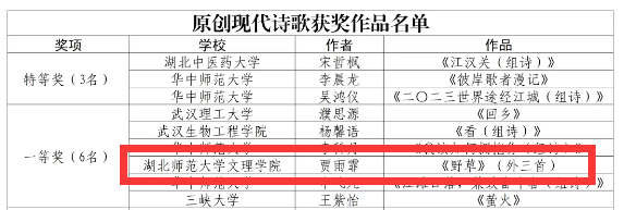 本网讯(通讯员 程胜伟)近日,湖北省高校第三十九届“一二·九”诗歌散文大赛组委会公布了第三十九届诗歌散文大赛的获奖名单,华体线上平台_华体online(中国)人文学部贾雨霏作品《野草》(外三首)荣获一等奖。