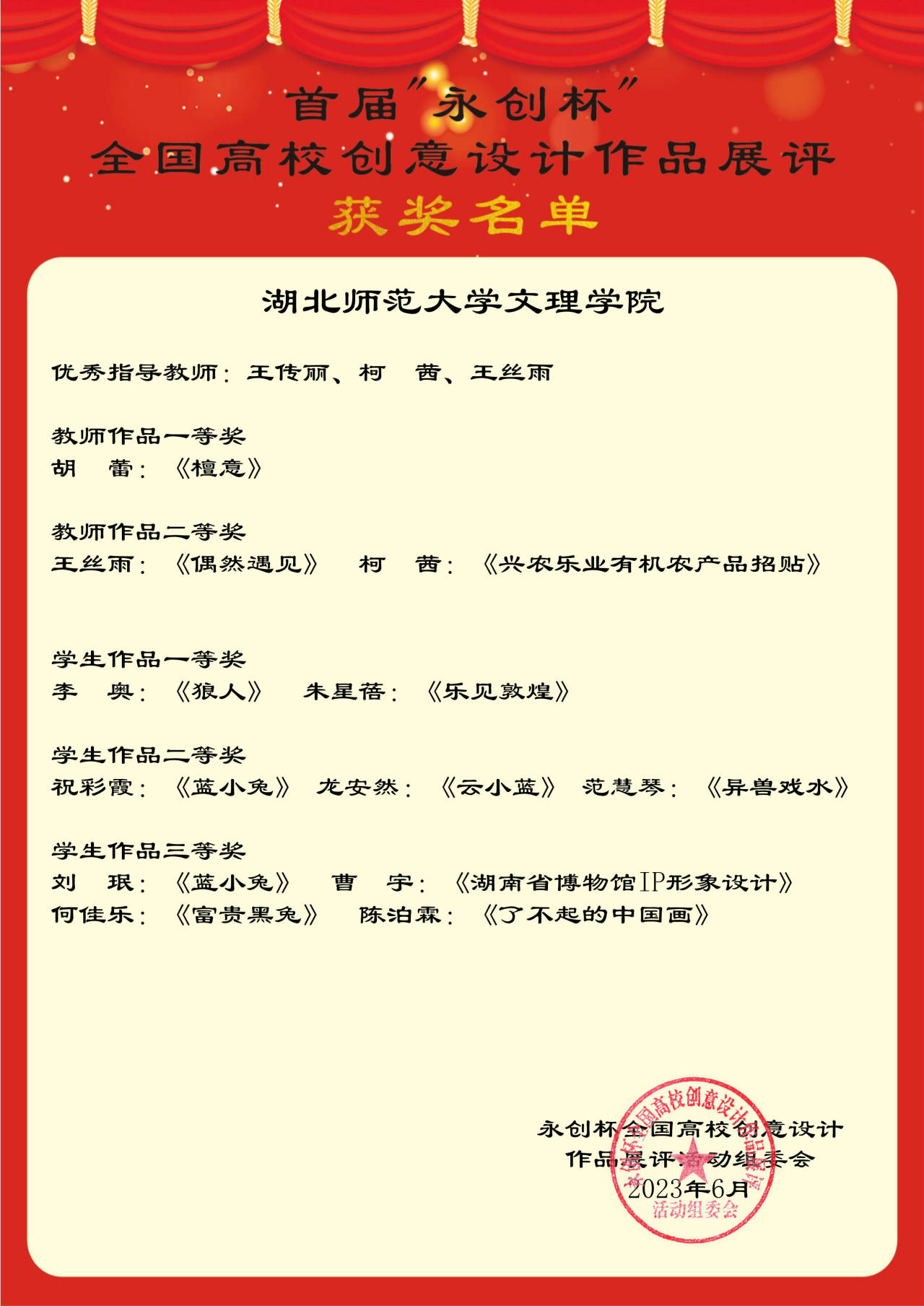【简报】2023年6月10日,由教育与艺术学部组织参加的中国基本建设优化研究会专业技术人才交流工作委员会举办的首届“永创杯”全国高校创意设计作品竞赛,我学部师生参加了平面设计和服饰设计两个赛道,其中服饰设计赛道胡蕾老师作品荣获一等奖,平面设计赛道王丝雨、柯茜老师作品荣获二等奖,学生李奥、朱星蓓同学获得一等奖、祝彩霞、龙安然、范慧琴获得二等奖、刘珉、曹宇、何佳乐、陈泊霖获得三等奖,王丝雨、柯茜、王传丽老师荣获优秀指导教师。特此喜报。